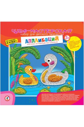 В комплекте: цветная основа с контуром рисунка и клеевым слоем, шарики из пенопласта четырёх цветов, деревянная палочка.